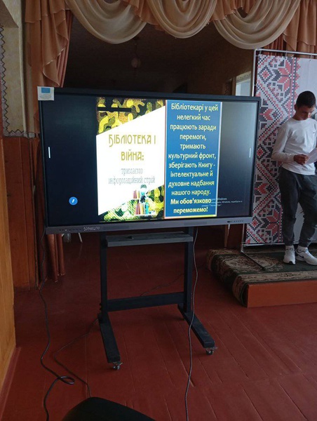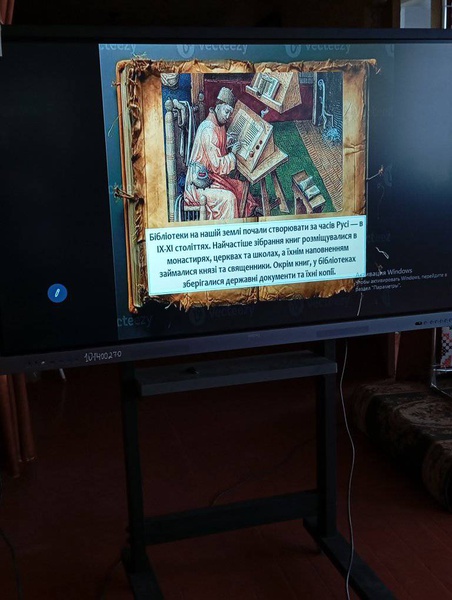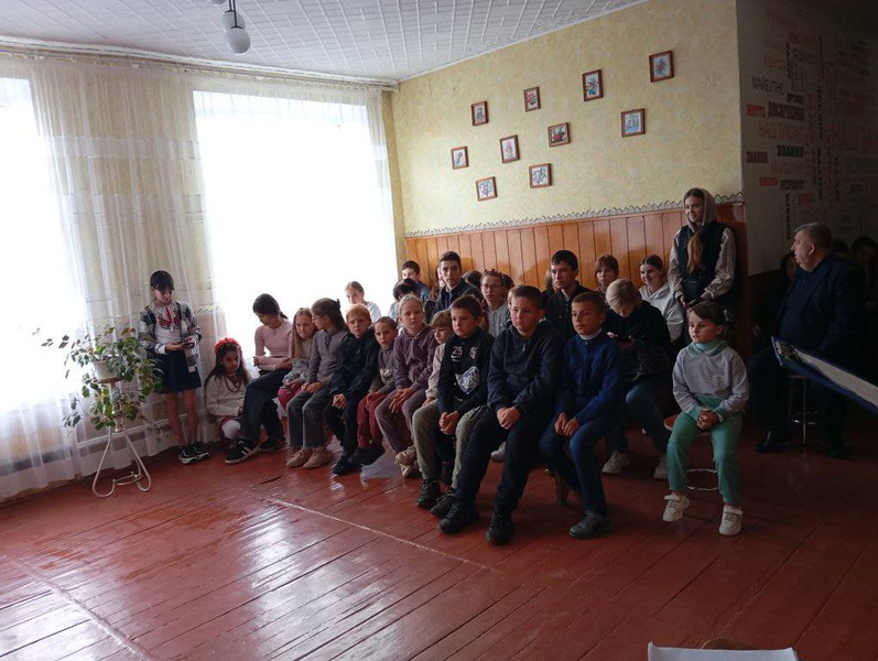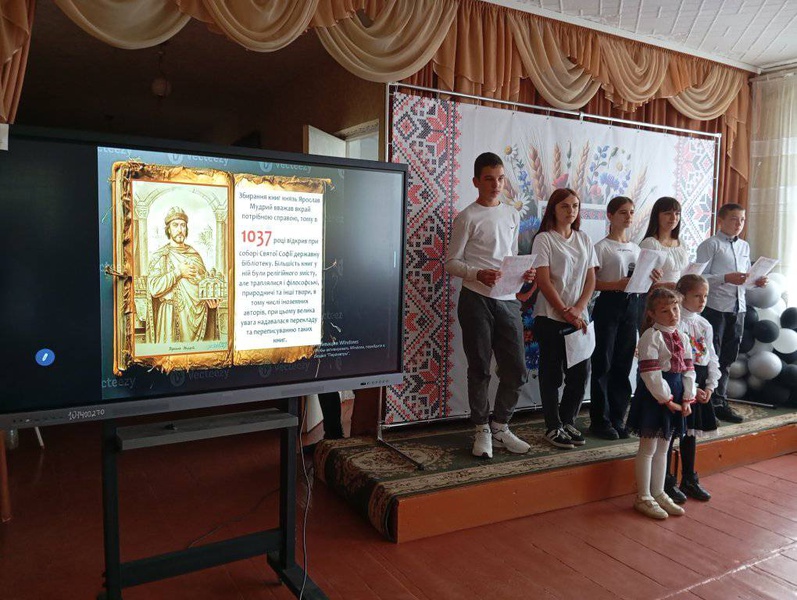 Бібліотекарка Тетяна Доманська ознайомила школярів із планом роботи бібліотеки на місяць, наголосила на значенні рідної мови у житті кожного українця та закликала активно брати участь у заходах.